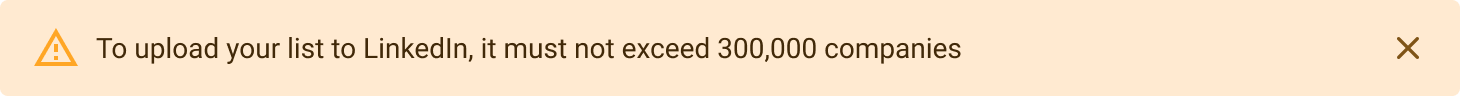 The list your generate must be below 300,000 records. This is a LinkedIn Campaign manager restriction. If you try to upload a list that exceeds 300,000 records you'll see the following toast.