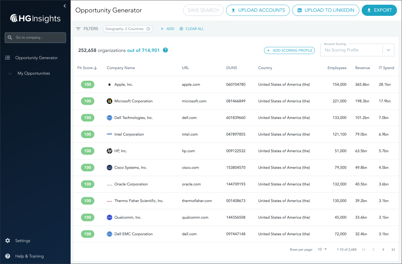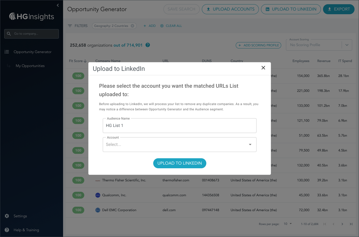 After you've successfully connected your LinkedIn account to the HG Platform, you'll see the UPLOAD TO LINKEDIN button in the top corner of Opportunity Generator.